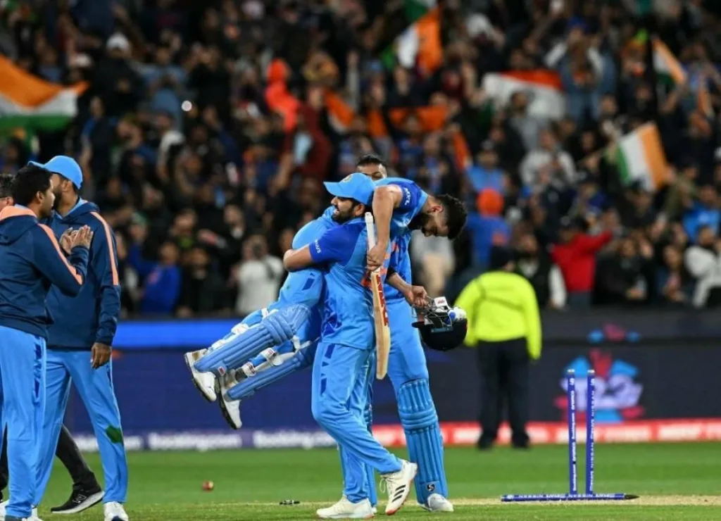 Rohit Sharma lifting Virat Kohli in celebration after a thrilling win.